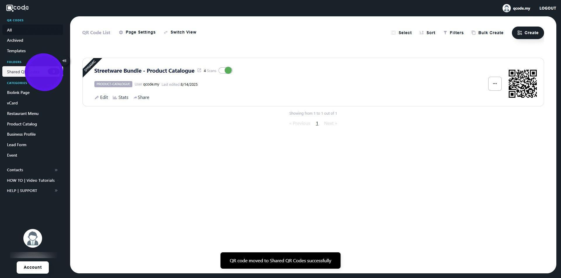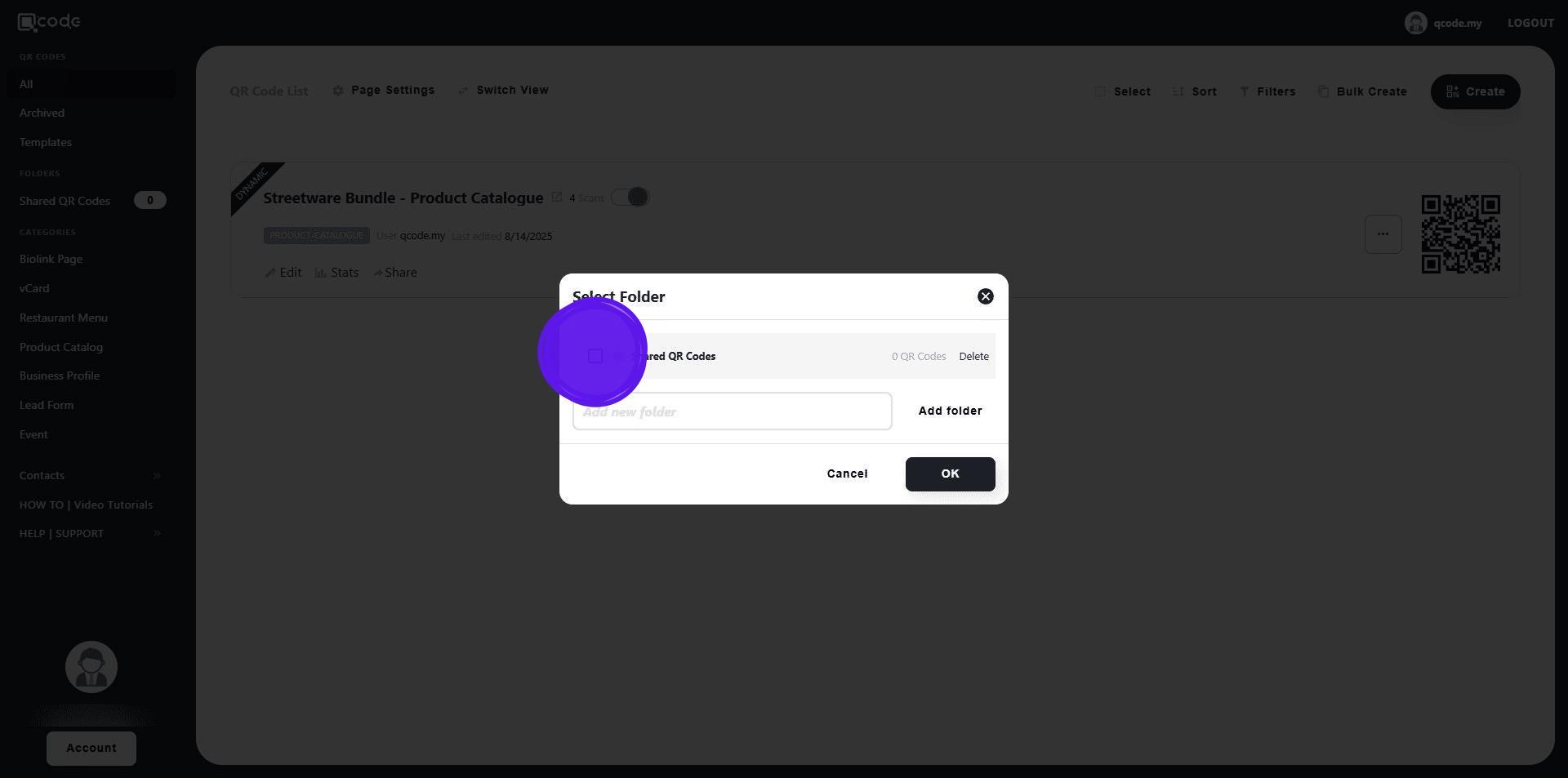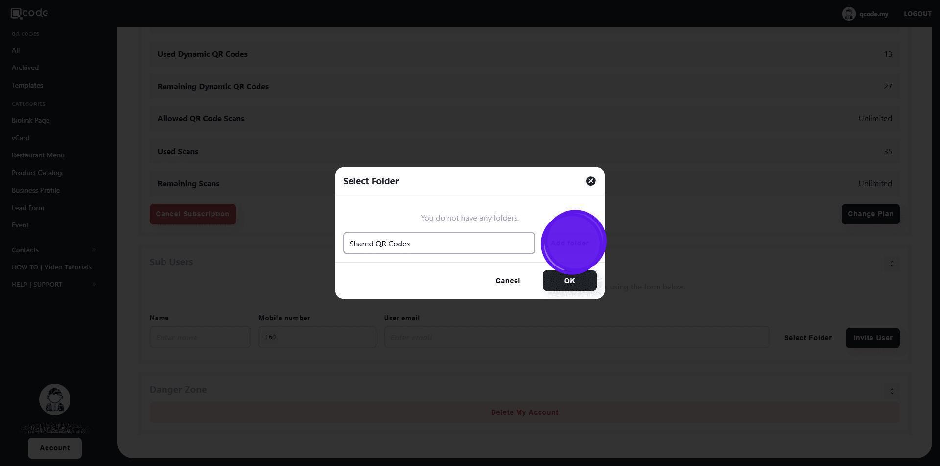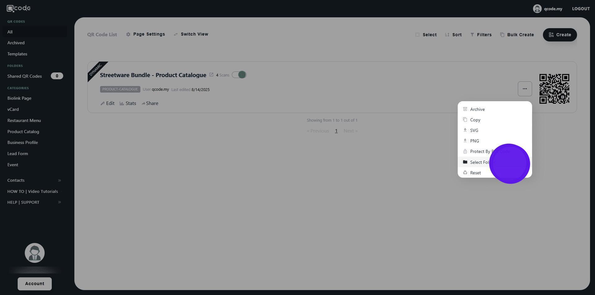 13. Choose the QR Code that you want to share with the Sub User by clicking on the three dots button