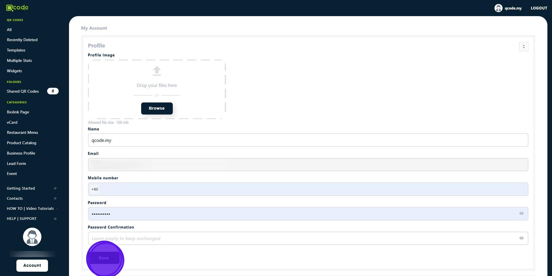 How to change your Account Information 1. Navigate to https://qcode.my/dashboard/qrcodes2. Click on Account3. Here you can change your Account information (Profile picture, Name, Mobile number, Password)4. Click on Save to save your changes