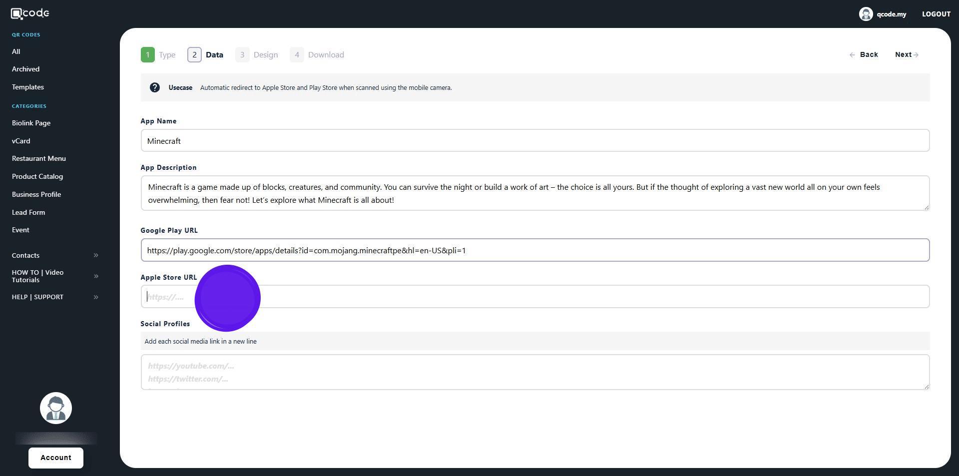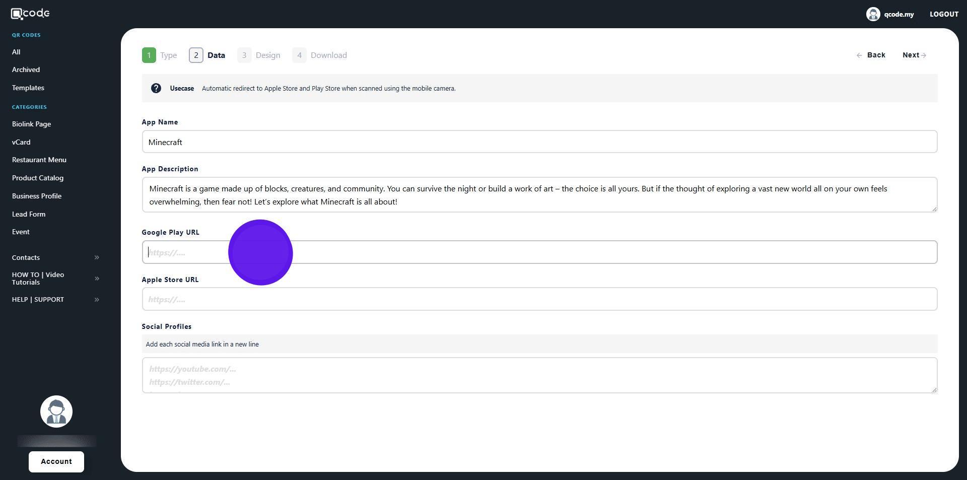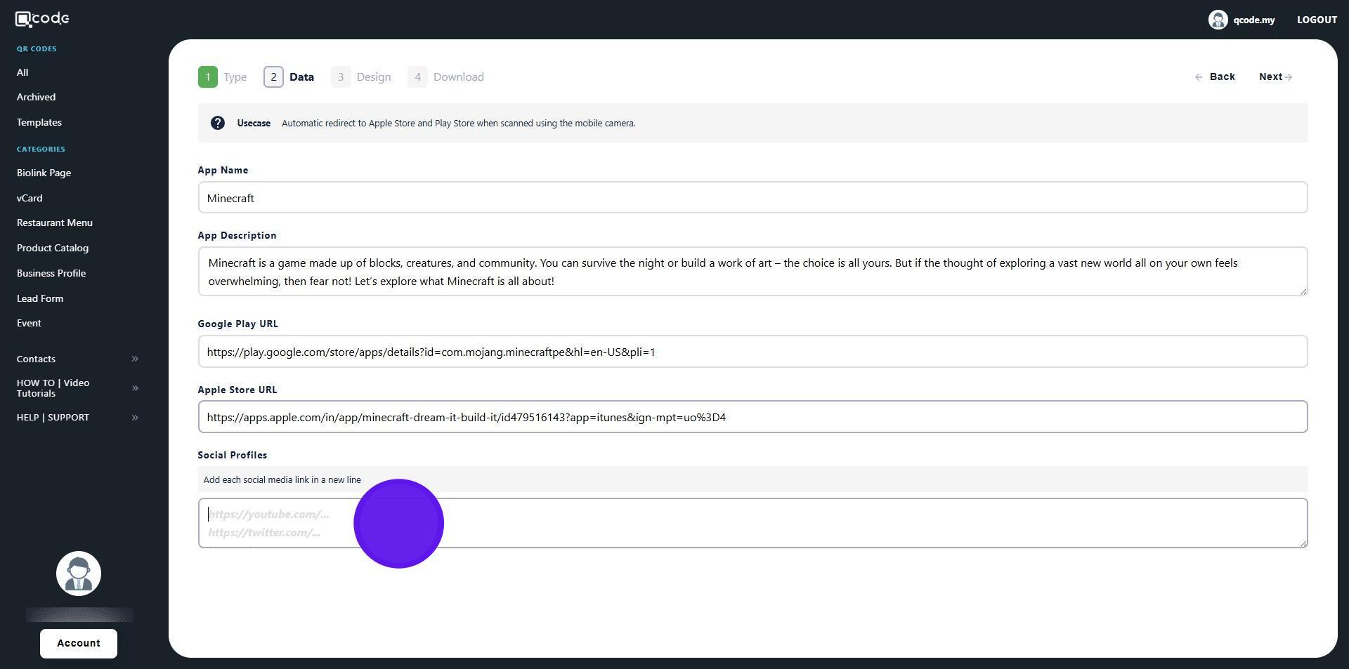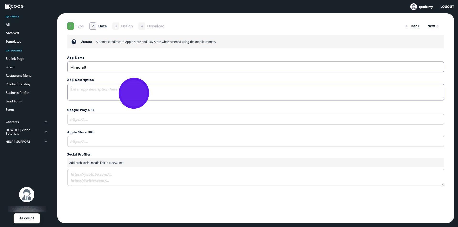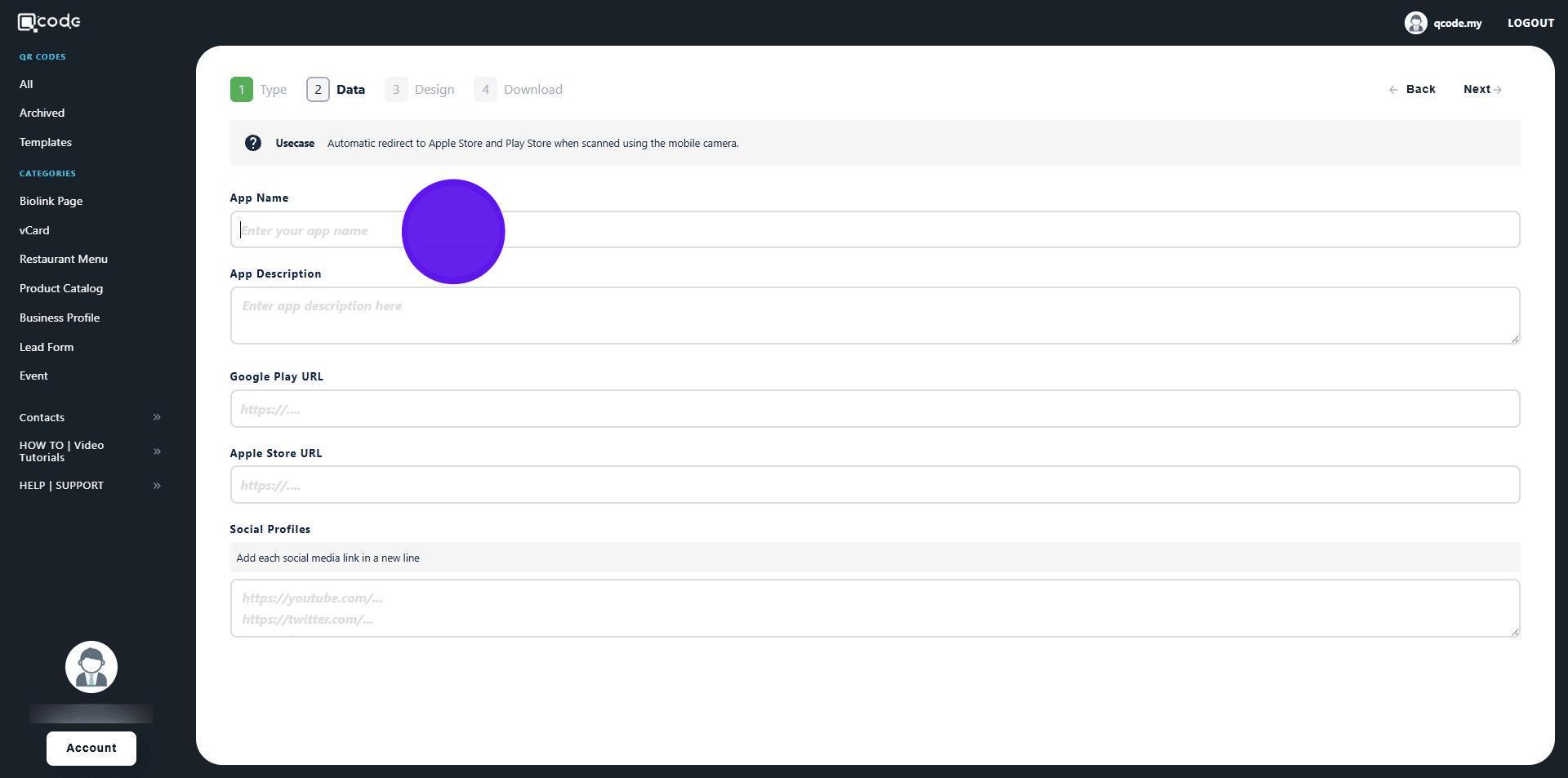 1. Navigate to https://qcode.my/dashboard/qrcodes