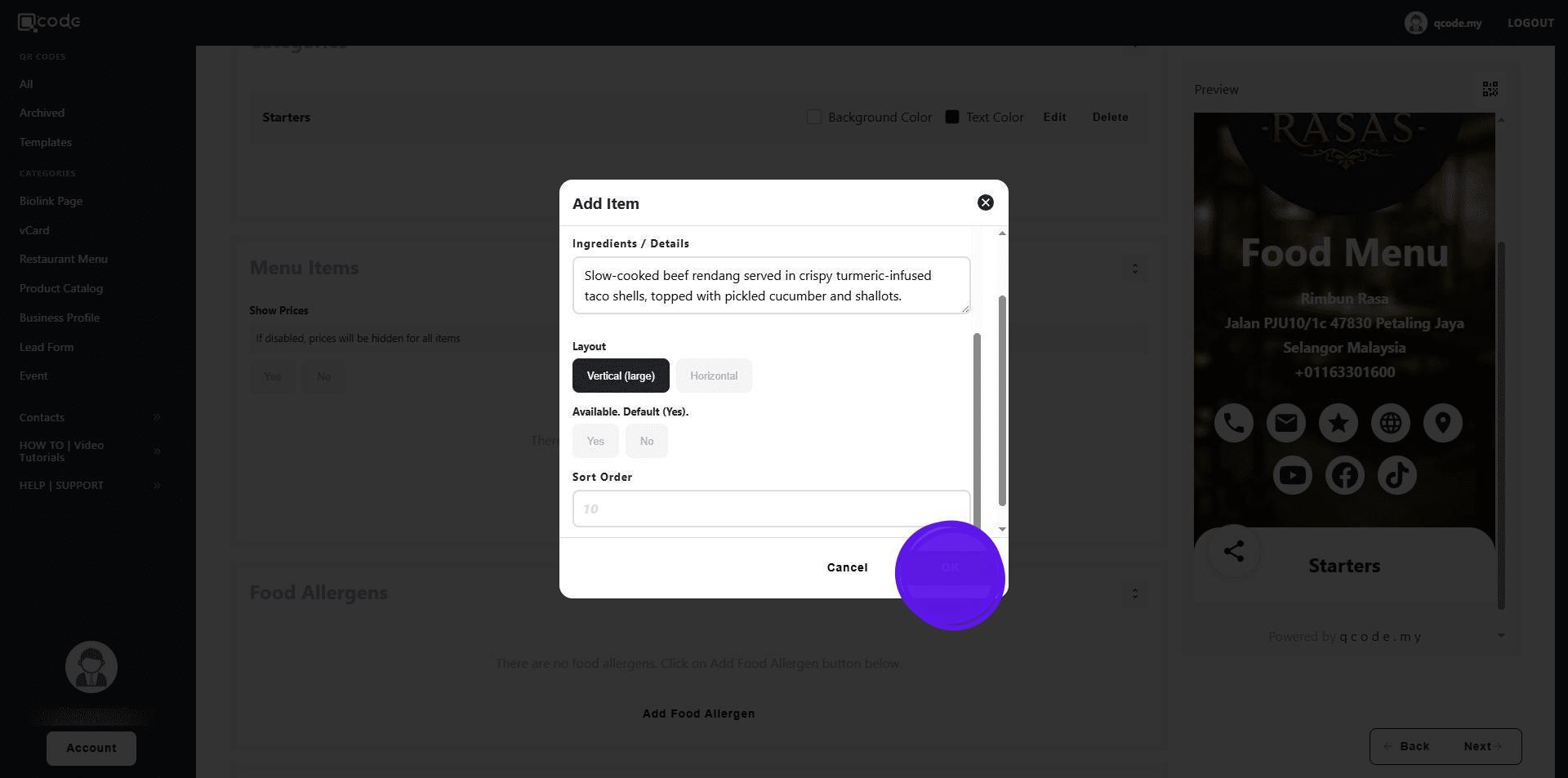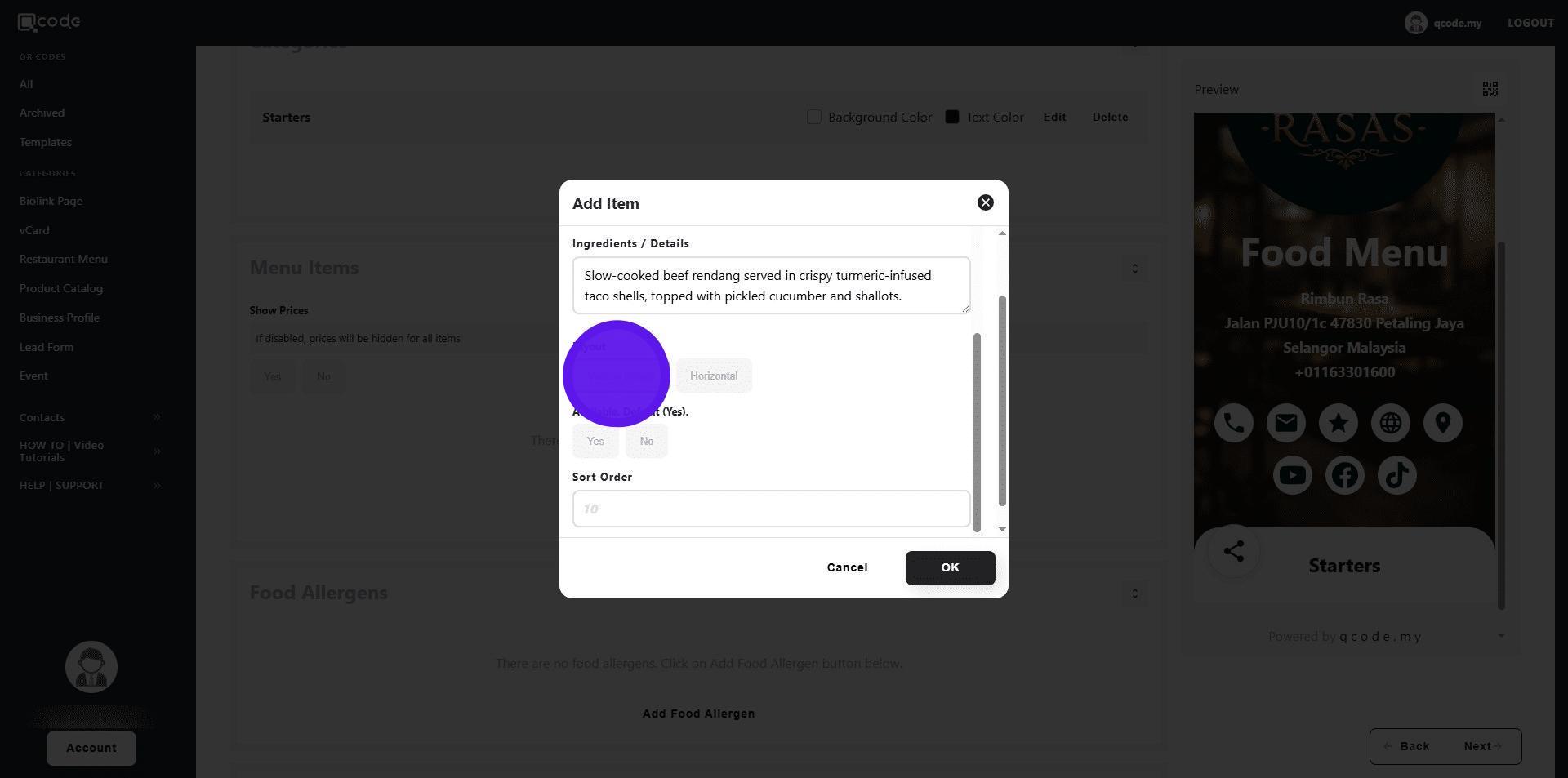 33. Click on Vertical (large) or Horizontal to choose the layout for the image of your Food item