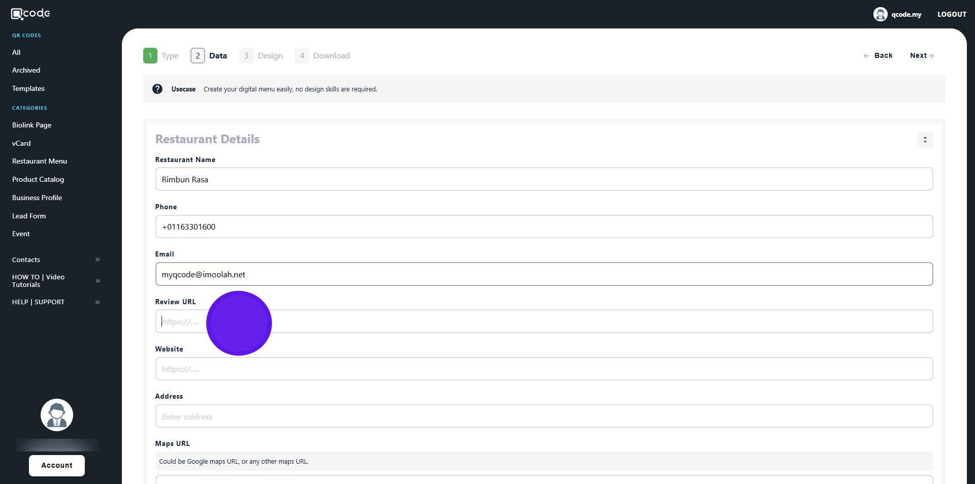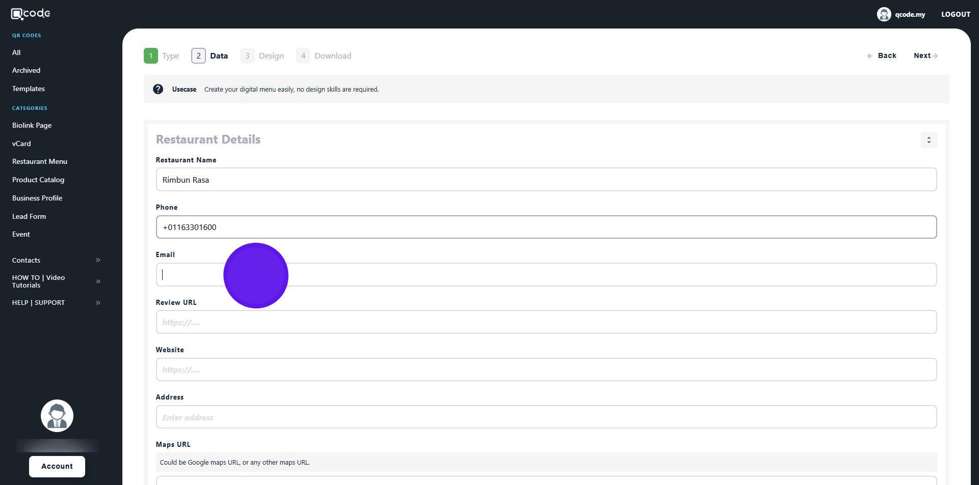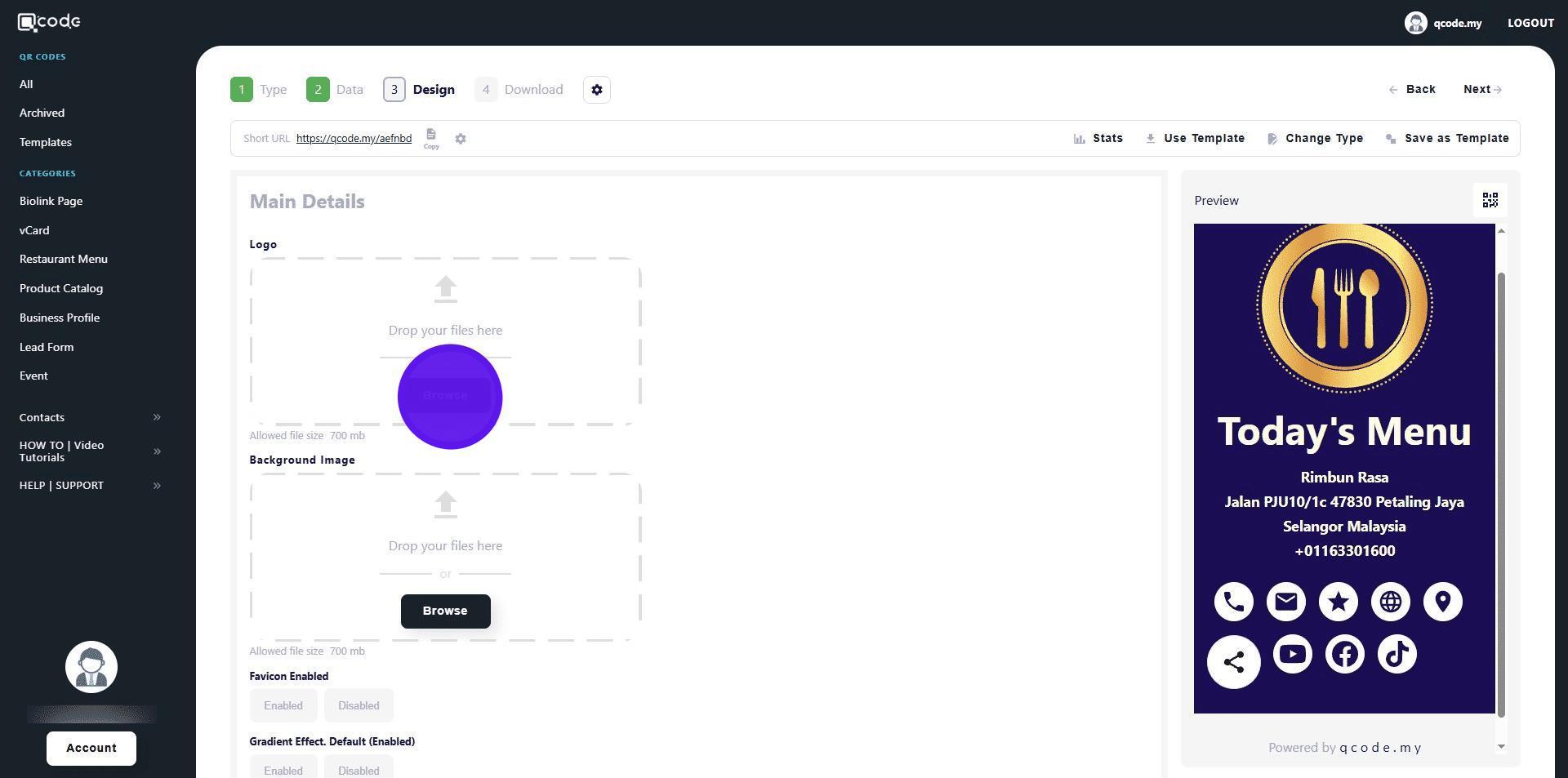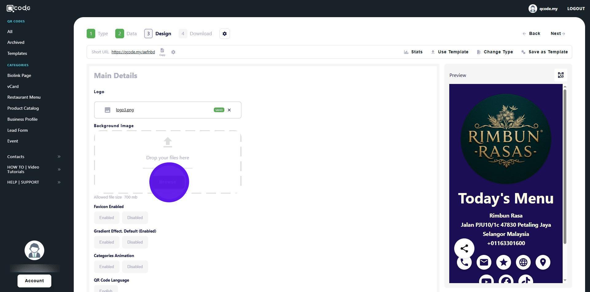 To create a digital restaurant menu with a QCODE.MY, follow these steps: Access the menu creation platform, enter your restaurant details, design the menu with categories and items (including names, prices, and images), customize the styling (colors, logo, background), and generate a QR code to download or share online. Finalize the slug before downloading to ensure functionality. Your menu is now ready for easy access via QCODE.MY.