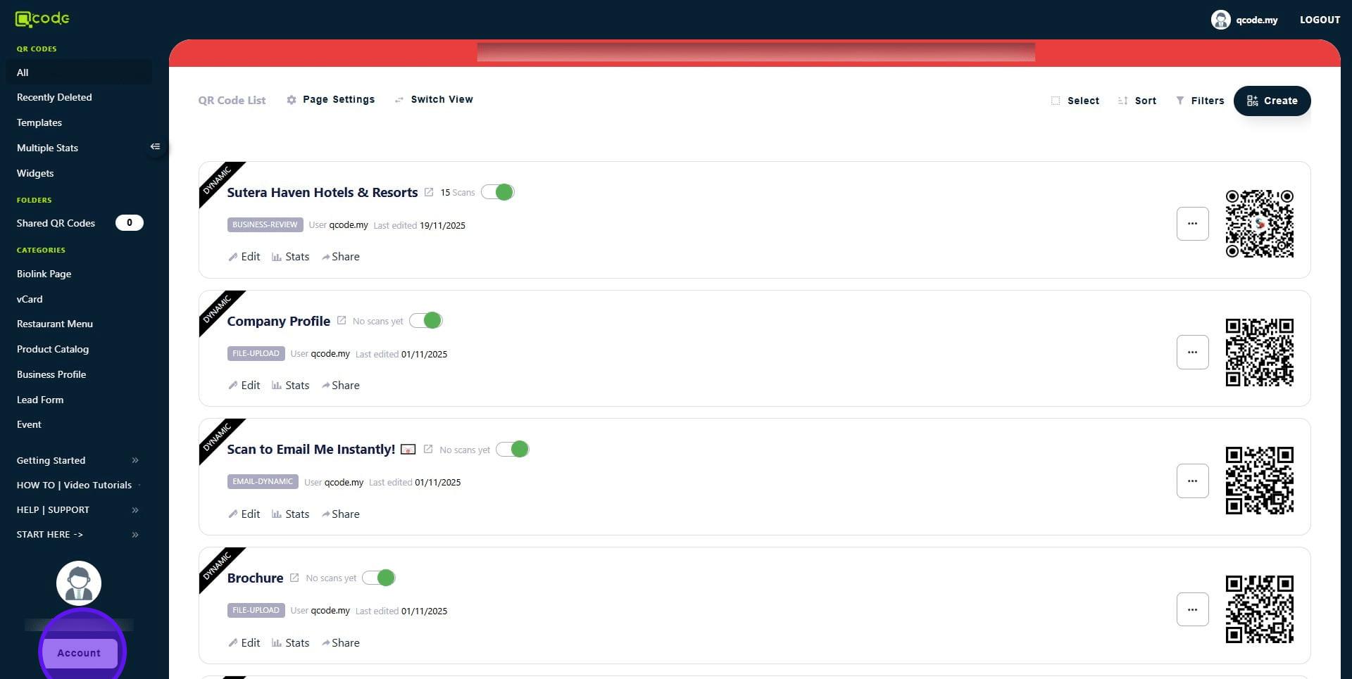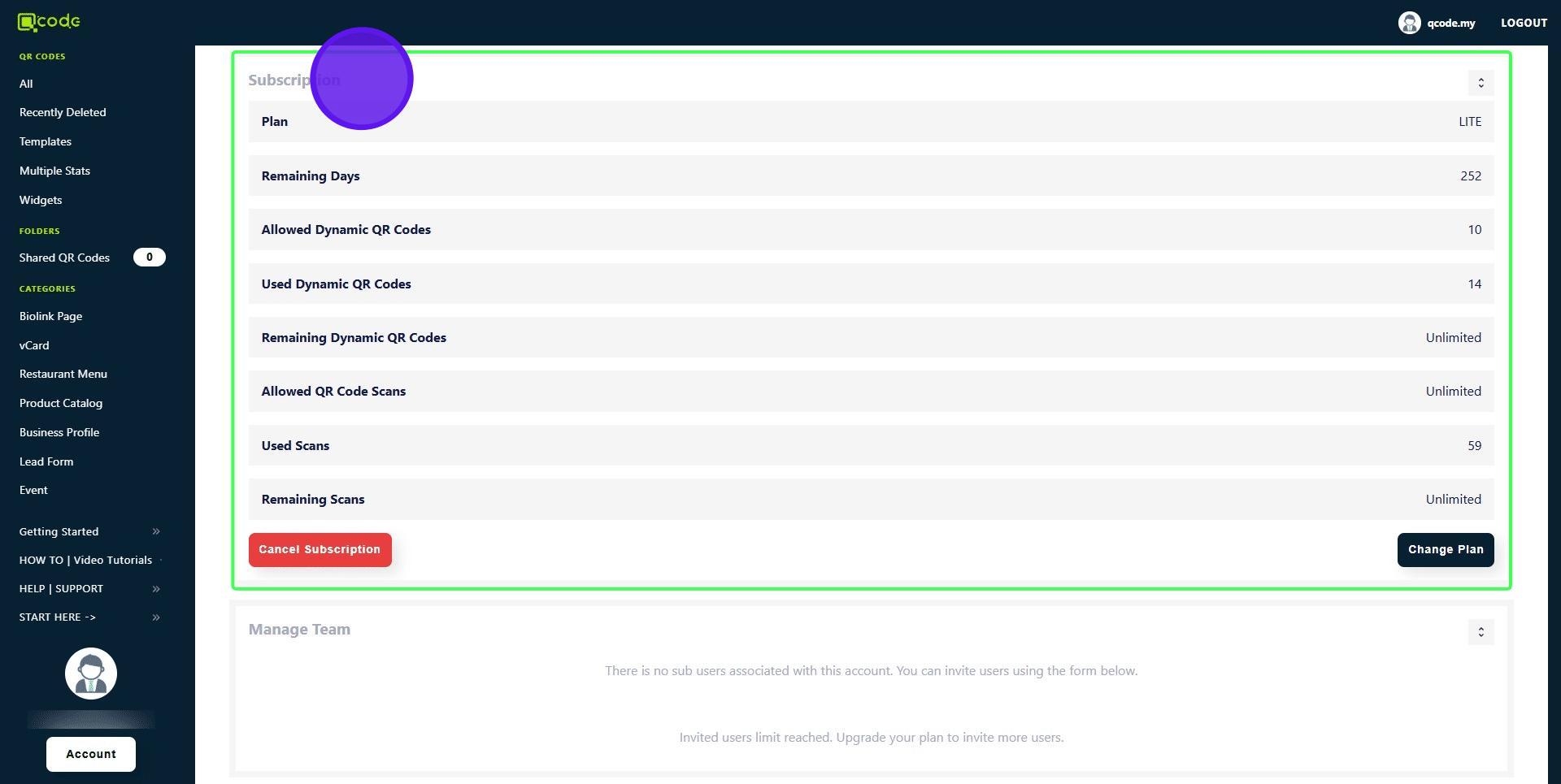 How to view your Account/Billing Details 1. Navigate to https://qcode.my/dashboard/qrcodes2. Click on the Account button3. Scroll down until you see the Subscription section4. Here you will find the Subscription details:Well done 🚀